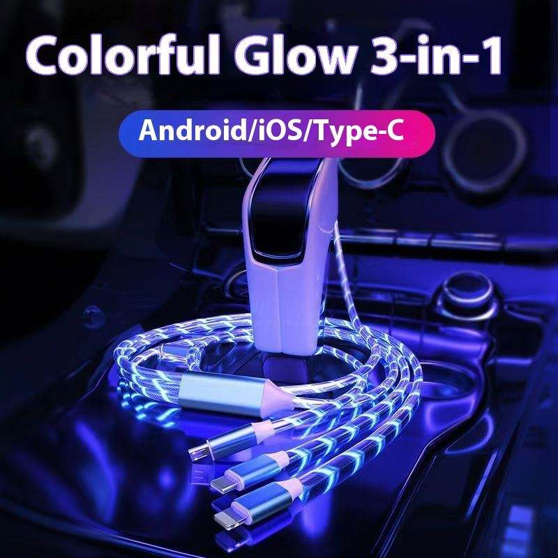 High-Speed 3-in-1 PVC Phone Charger with Glowing Flowing Light Trending Fast Charging USB Data Cable High-Speed 3-in-1 PVC