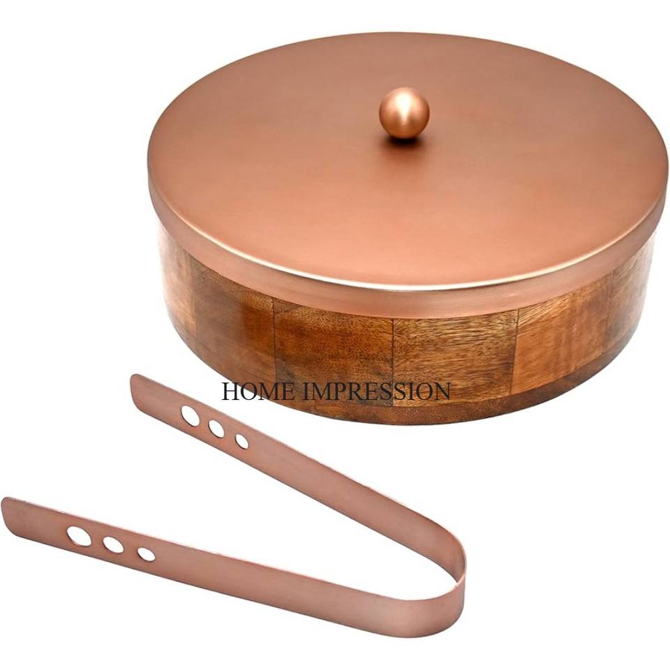 High Standard Quality Acacia Wooden Chapati Roti Storage Container With Enamel Finished Fancy Designer Lid With Tong for Serving