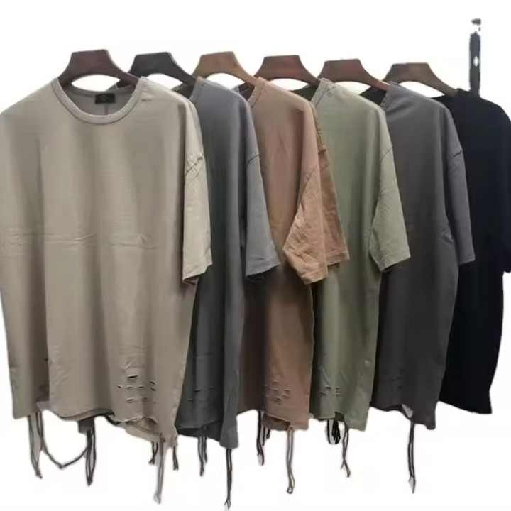 High Street Drop Shoulder Cut Man Ripped Knitted Tshirt Hemp Cotton Fabrics Oversized Acid Vintage Washed Edging