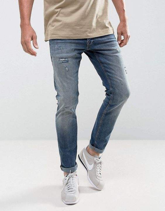 High Street Men's Premium Quality Jeans Pants Mid Denim Tag Distressed Wash Fashion Print Pattern Cotton Straight Pocket Waist
