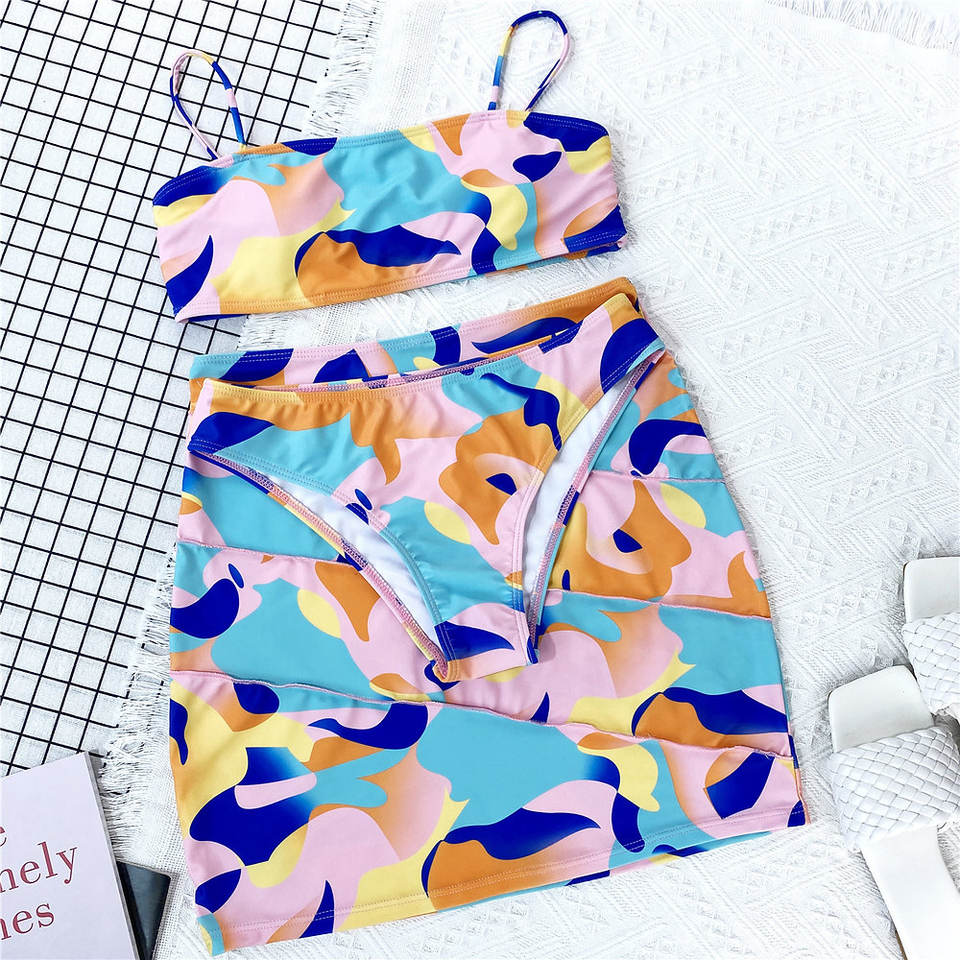 High Waist 3-Piece Bathing Suit Bandeau Neckline XL Size Breathable Digital Printed Cover-Up Featuring Letter Fruit Knitting