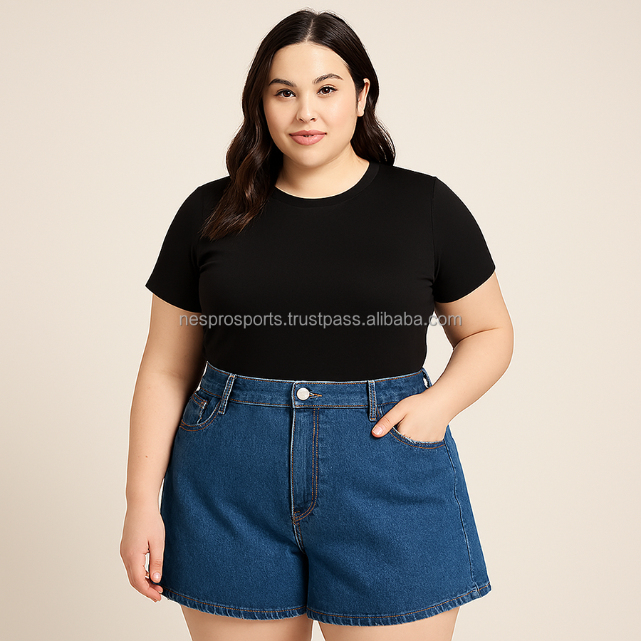High Waist Plus Size Women Denim Shorts Eco-Friendly Polyester/Cotton Ripped Distressed Style Elastic Waistband Streetwear