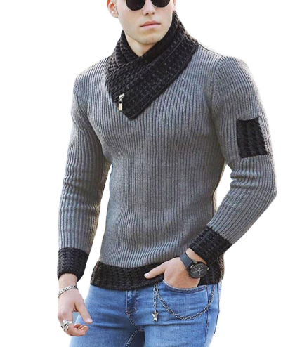 High demand Mens gray ribbed sweater with black shawl collar and zipper detail