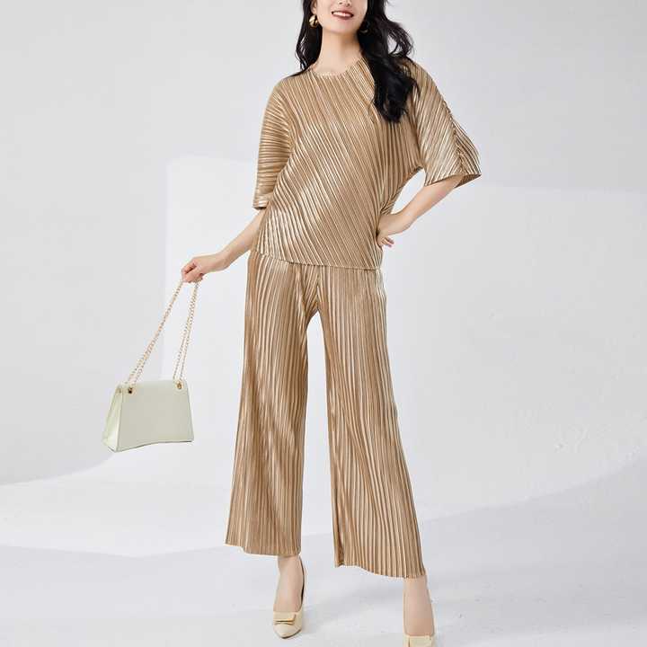 High-end Summer Women's Suit New Style Metal Sequins Loose Large Size Miyake T-shirt Pants Two-piece Set