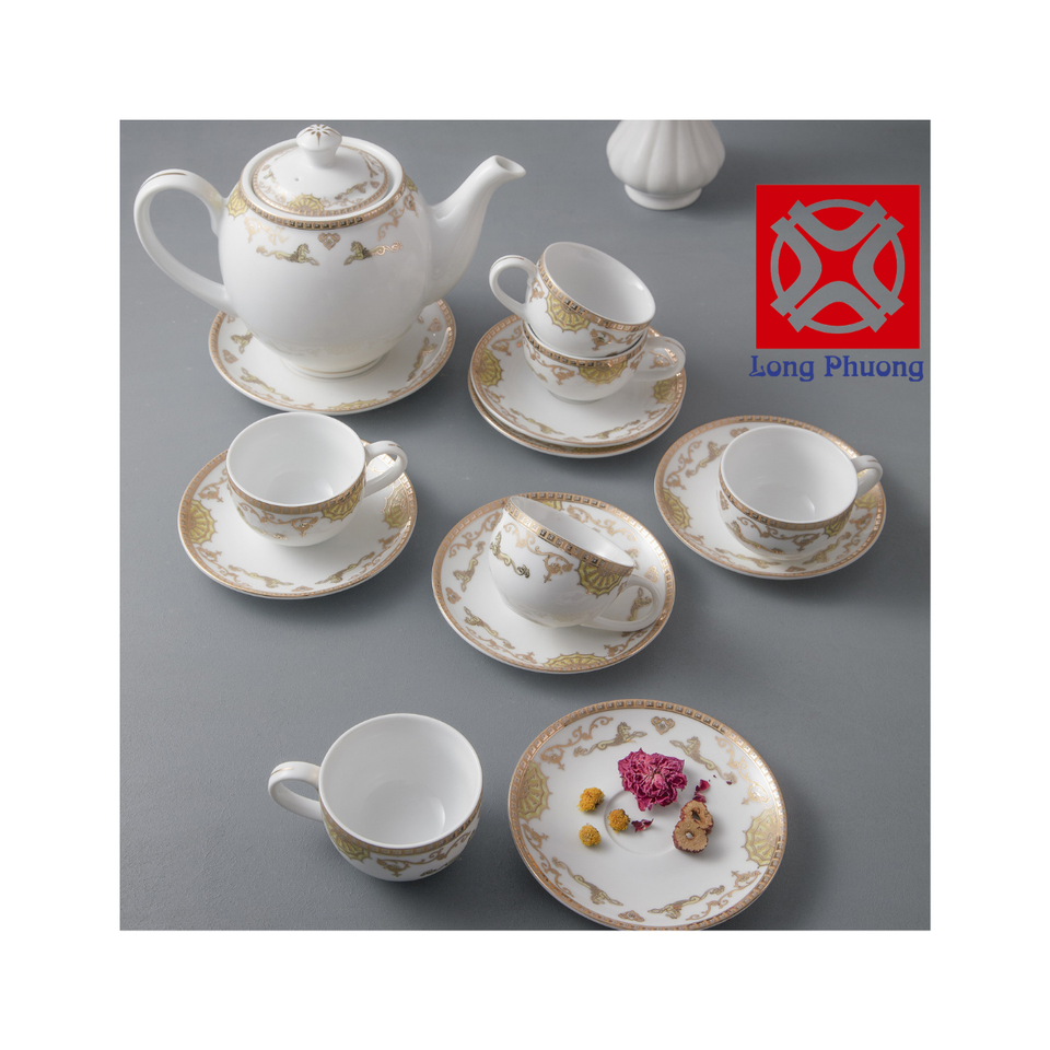 High Quality 6pcs Porcelain Coffee Teacup Decor White Ceramic Tea Pot and Cup Set Manufacture Long Phuong Group Supplier