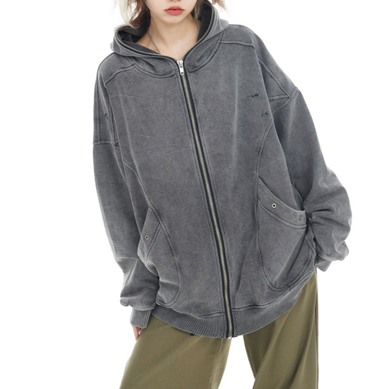 High quality cotton distressed Hoodie oversize Vintage Acid Washed Full Zip Up Hoodie With Pockets Loose hoodie Customize Make