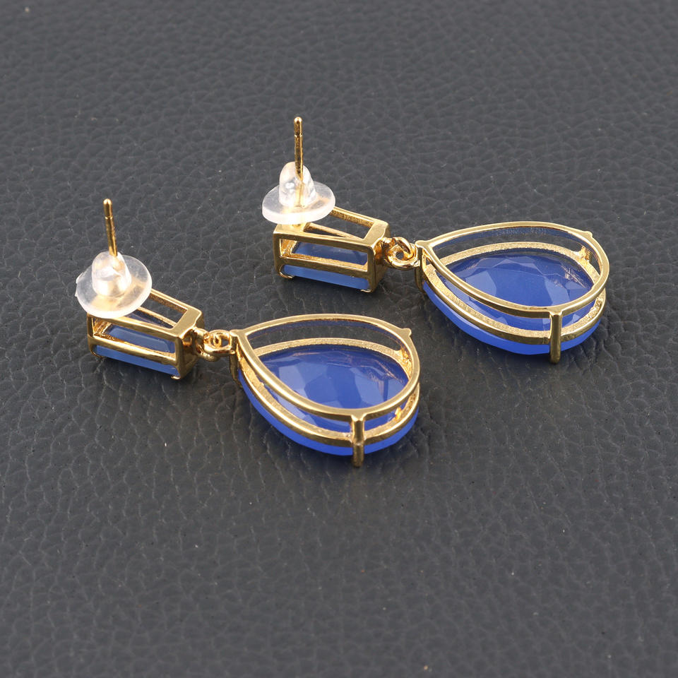 High Quality Faceted Cut Blue Chalcedony Double Stone studded Drop Earring Brass Gold Plated Cocktail Statement Dangle Earrings