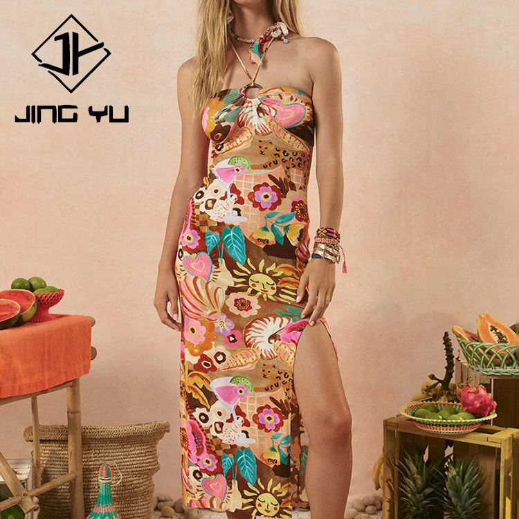 High-quality fashionable printed halter neck slit midi dress custom Contains linen Modal beach dress