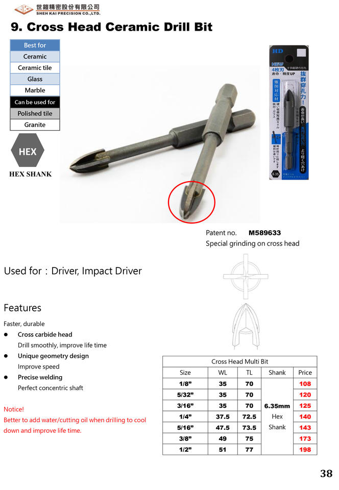 High Quality Hex Shank Cross Head Drill Bit for Ceramic Tile Glass Patent Design