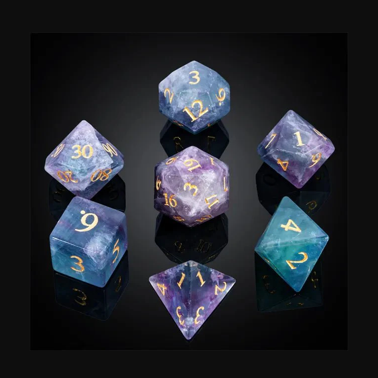 High quality stone dice Rainbow fluorite natural crystal reiki healing gemstones Engraved stone custom diceset Vikings crystal