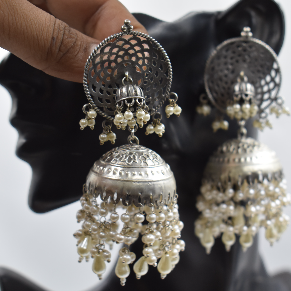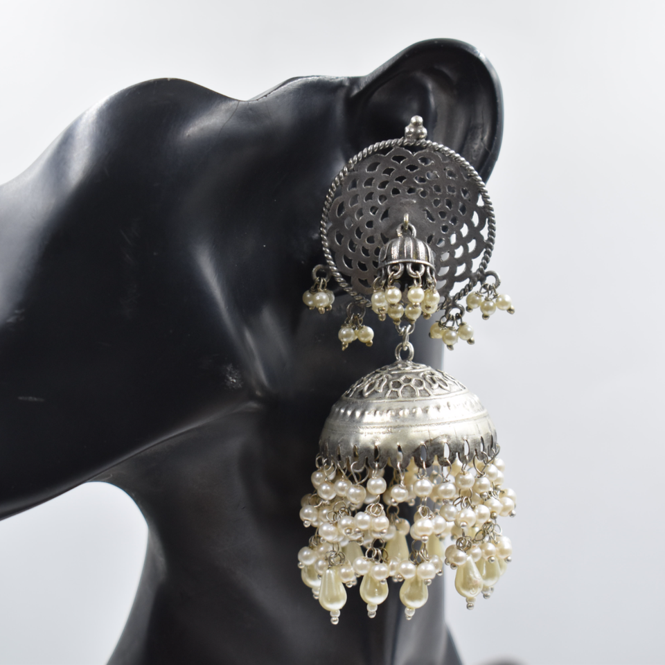 High quality women's stud earrings white pearl beads silver look alike kundan jhumka earing brass handmade wholesale jewelry
