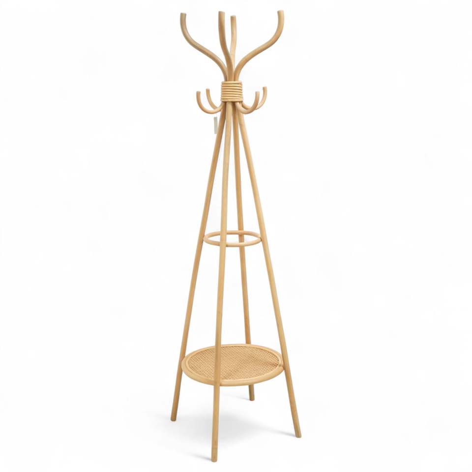 High quality wooden coat hanger stand sustainable rattan floor racks for home organization
