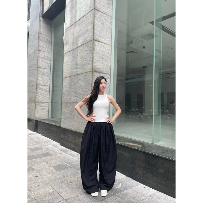Highest Quality Wide Leg Summer Black Streetwear Women Pants Slimming Casual 100% Polyester Elastic Waist Lace Beading Painted