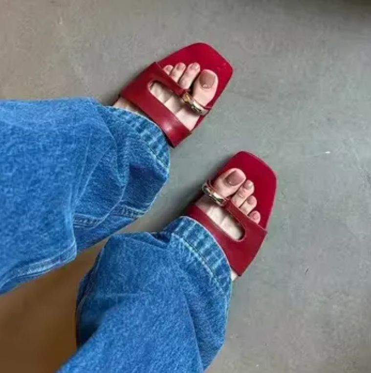 Highquality Genuine Sheepskin Leather Elegant Square Split-Toe Buckle Low-Heeled Slip-On Sandals