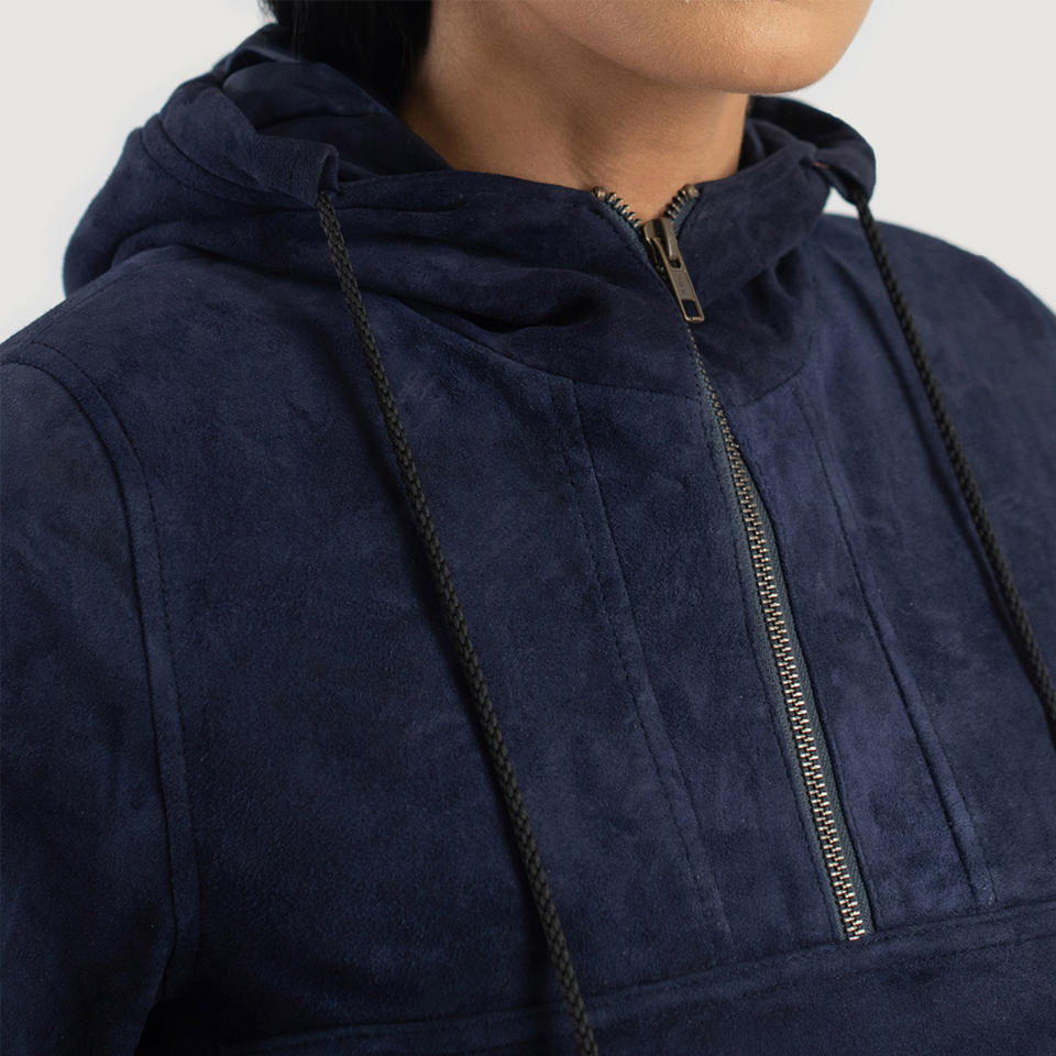 High Quality Women's Zest Blue Hooded Suede Pullover Customized Design Cowhide Full Grain Leather Denim Jacket for Autumn