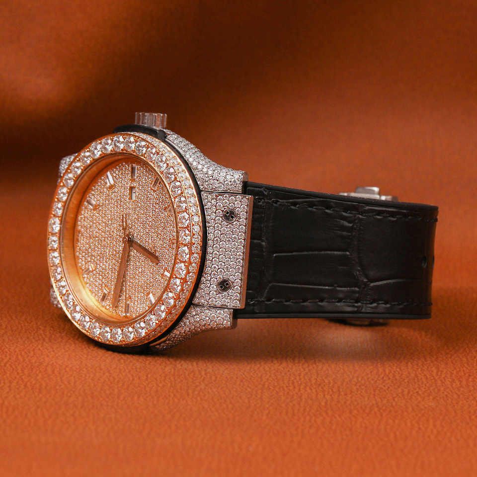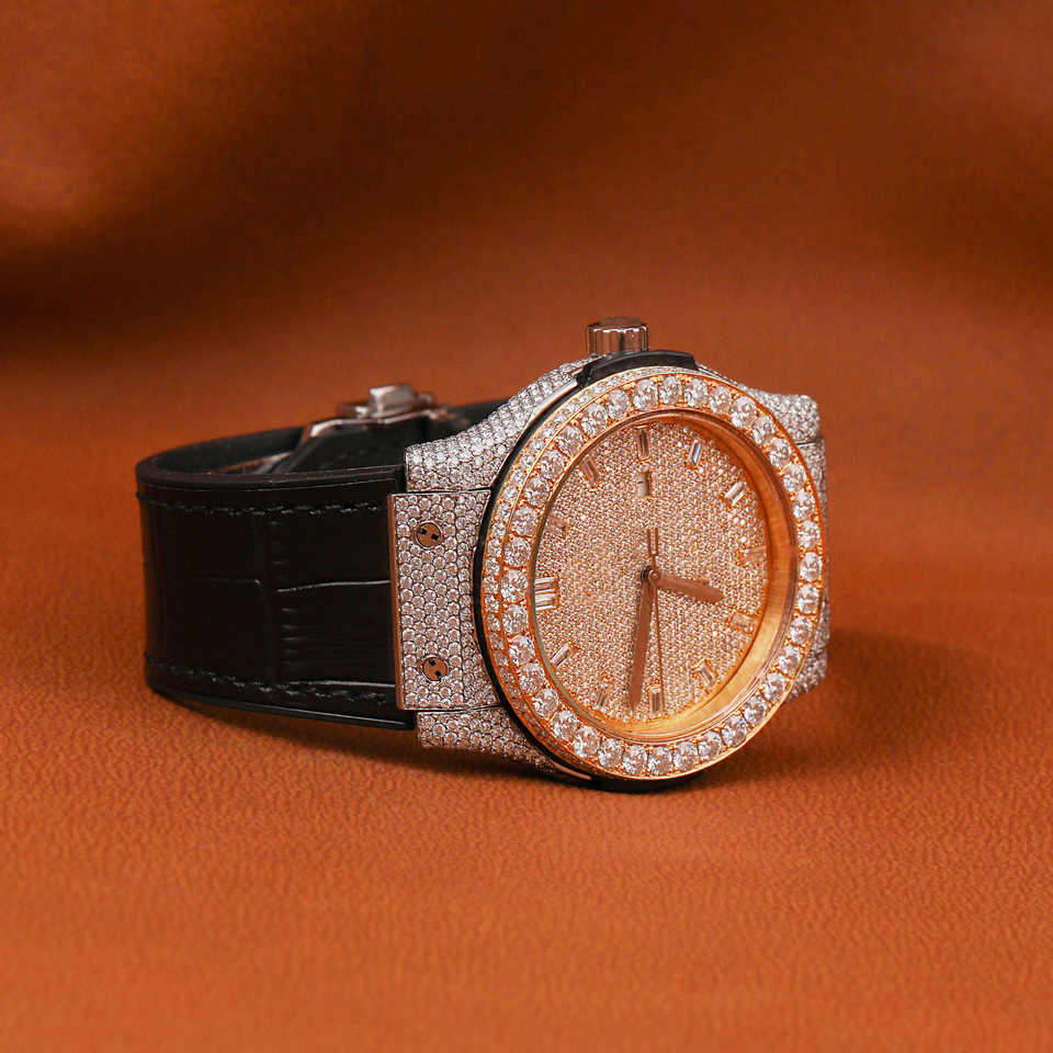 Hip Hop Luxury Fashion Men's Stainless Steel Leather Band Analog Glass Dial Mechanical Watch with Moissanite Diamonds Unisex