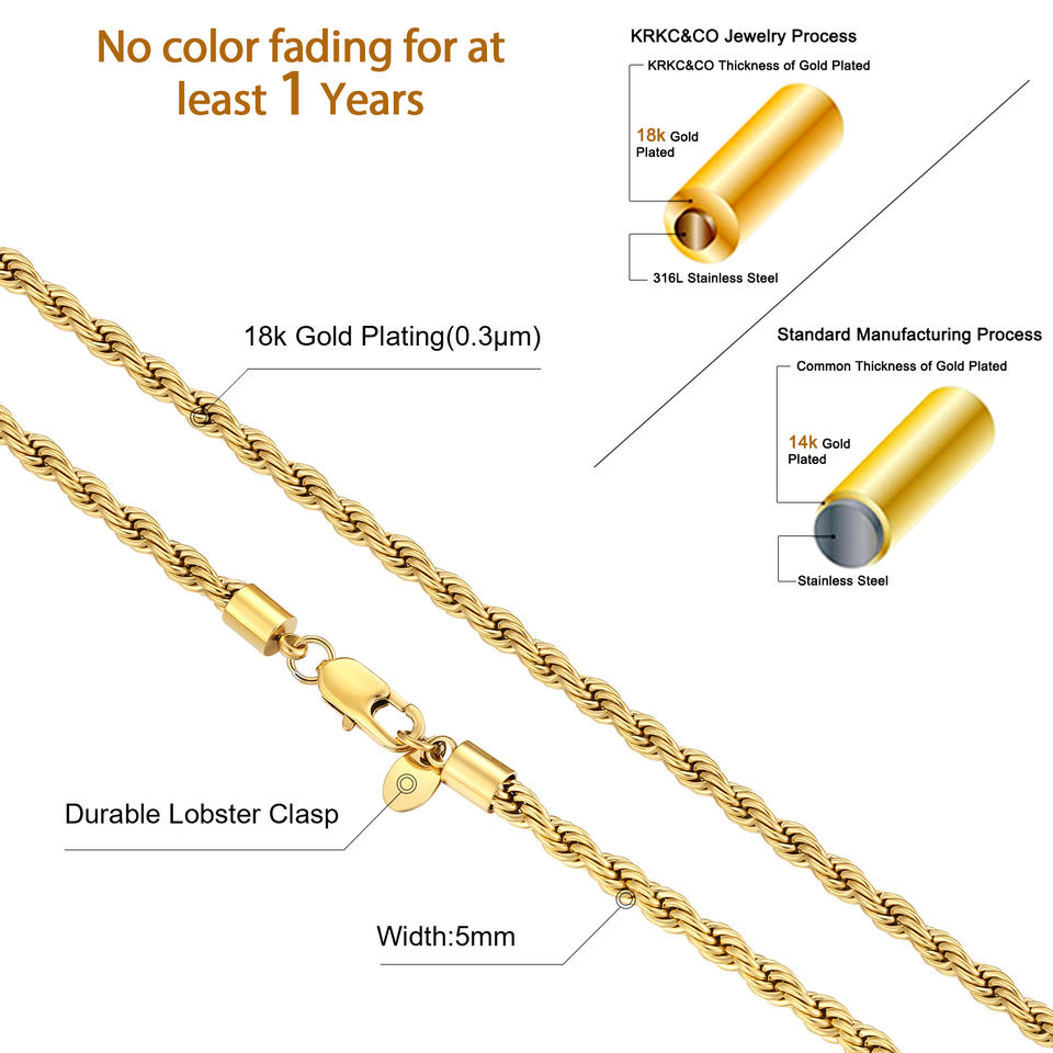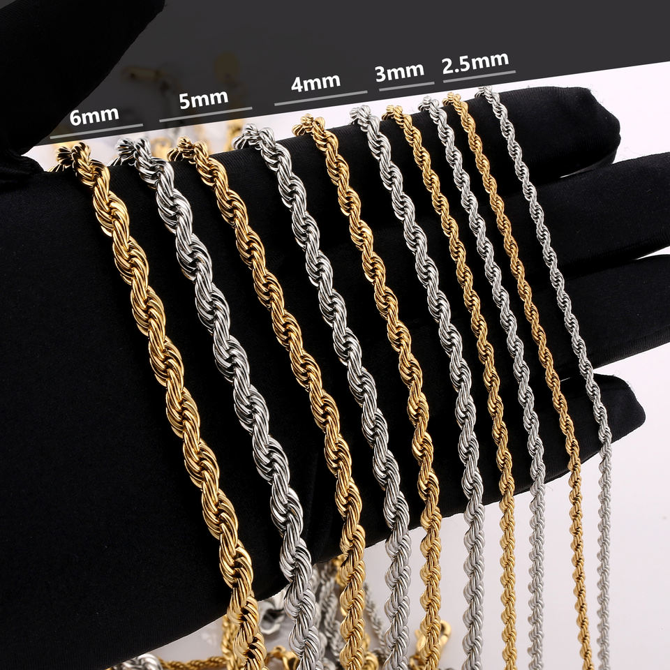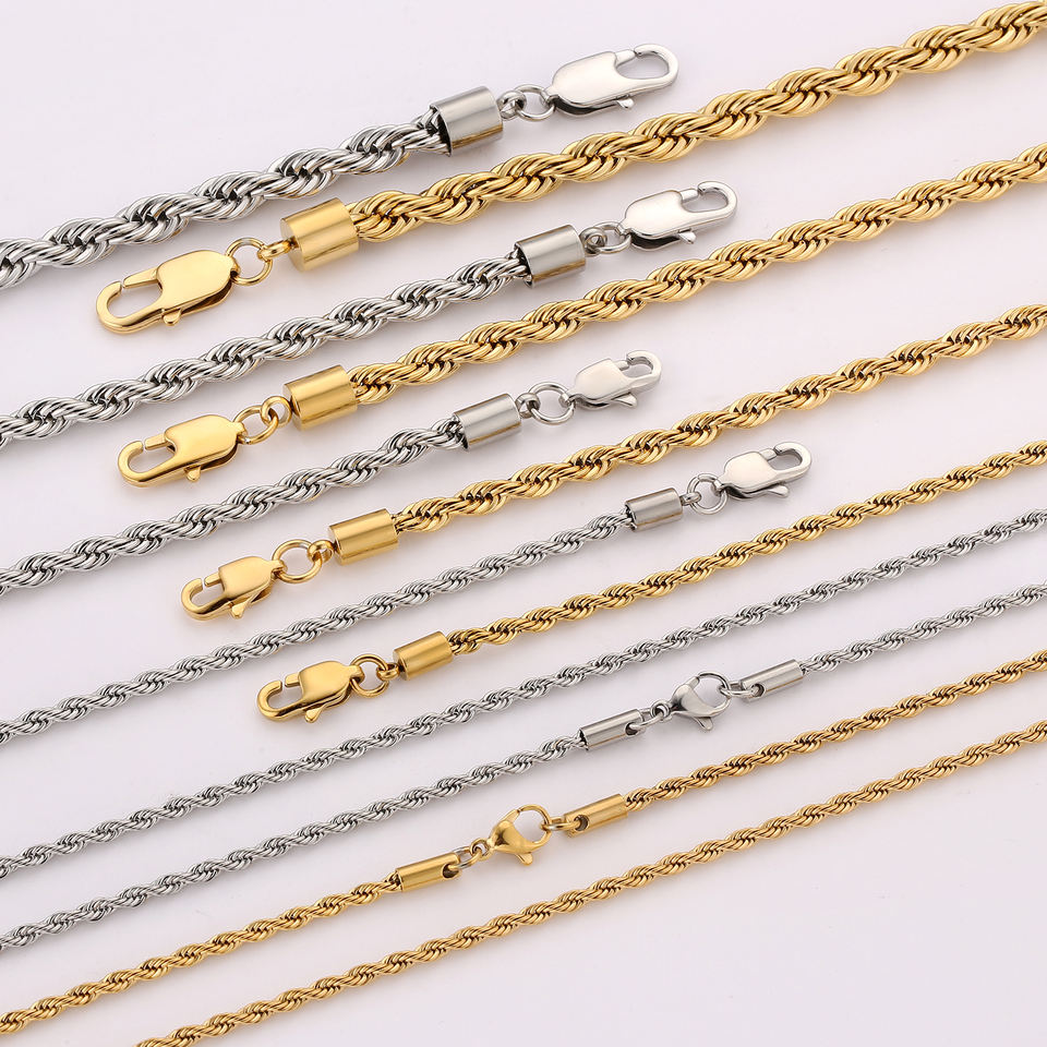 Hip Hop Rope Necklace Stainless Steel Twist Waterproof Jewelry Gifts 18K Real Gold Plated 5MM Thickness Rope Chain for Women Men