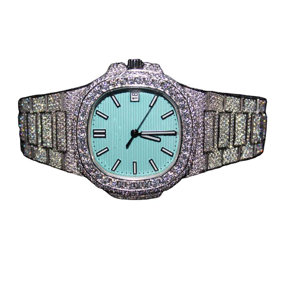 Hip Hop Stainless Steel Band Watch with Moissanite Diamond Quartz Movement for Business Wear Date Function for Men and Women