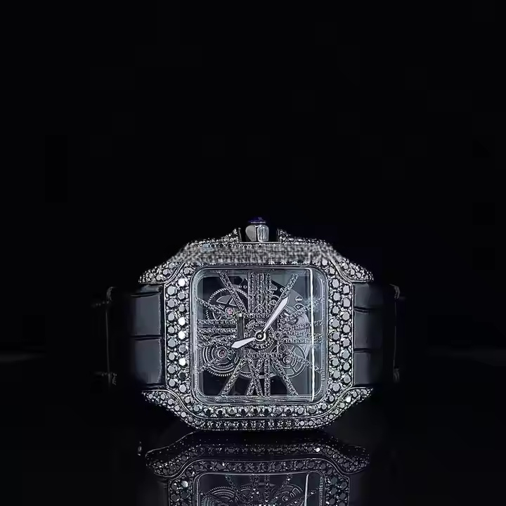 Hip Hop Style Luxury Watch VVS Clarity Moissanite Black Diamond Leather Band Square Diamond Luxury Watch For Men and Women