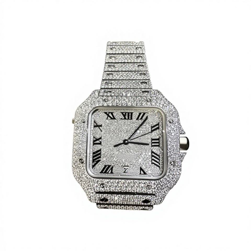 Hip Hop Style Square Glass Moissanite Watch Fully Iced Out Automatic Movement Power Reserve 38mm Stainless Steel Dial Wristwatch