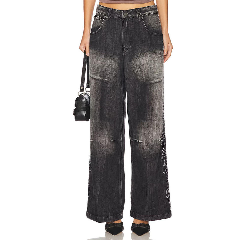 Hip Hop Vintage Washed Baggy Wide Leg Jeans Pants For Women Custom Rhinestones Latest Style Loose Fit Waist Jeans