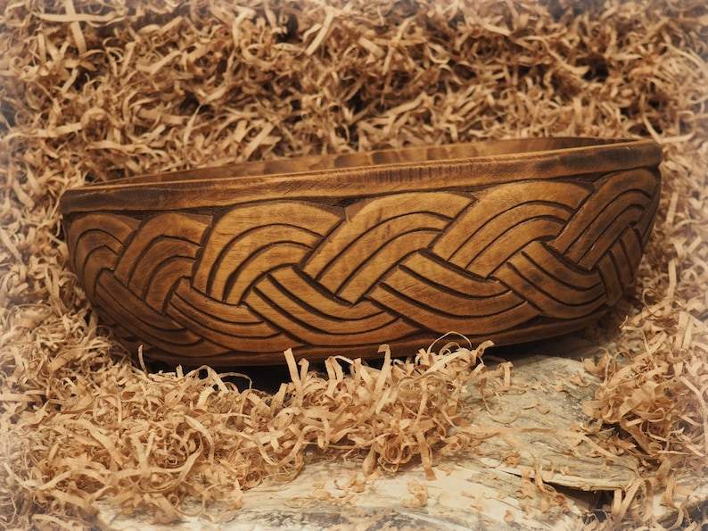 Historical Hand Carved Wooden Bowl with Vikings Plait Motive Fruit Bowl Decorative Handcrafted