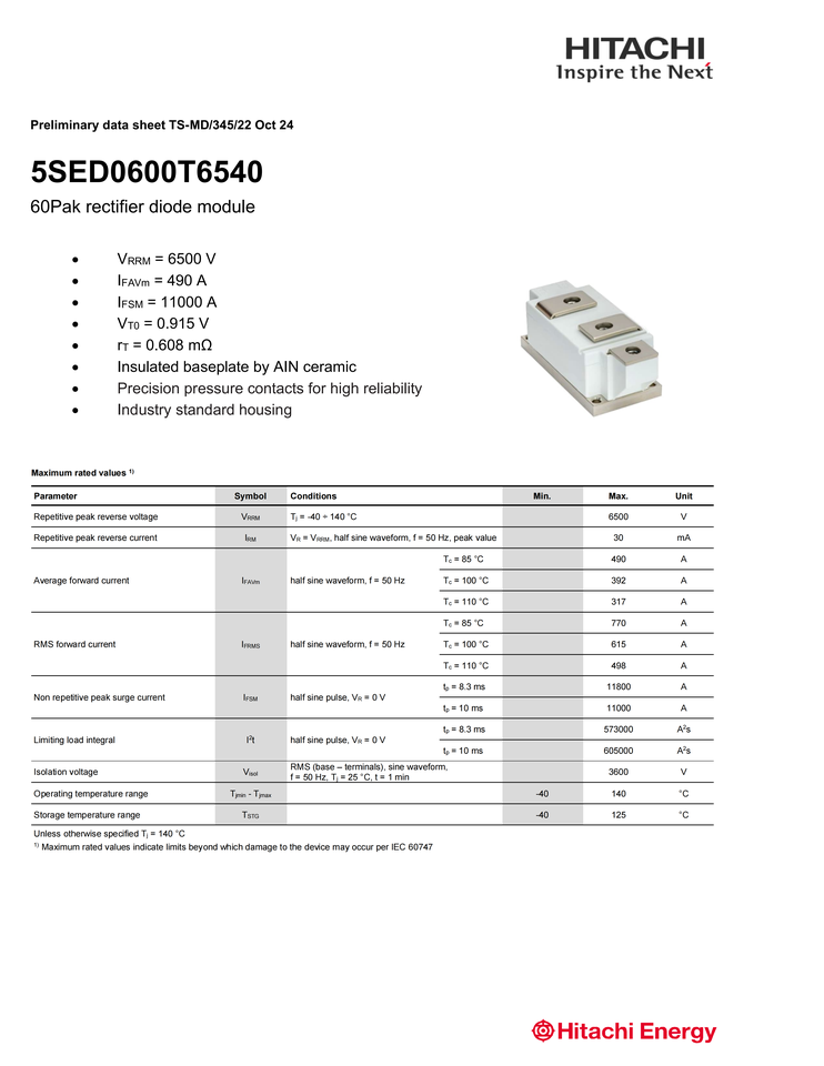 Hitachi Energy 5SED0600T6540 60Pak phase control thyristor module 6500V 490A soft starters VSD renewable energy