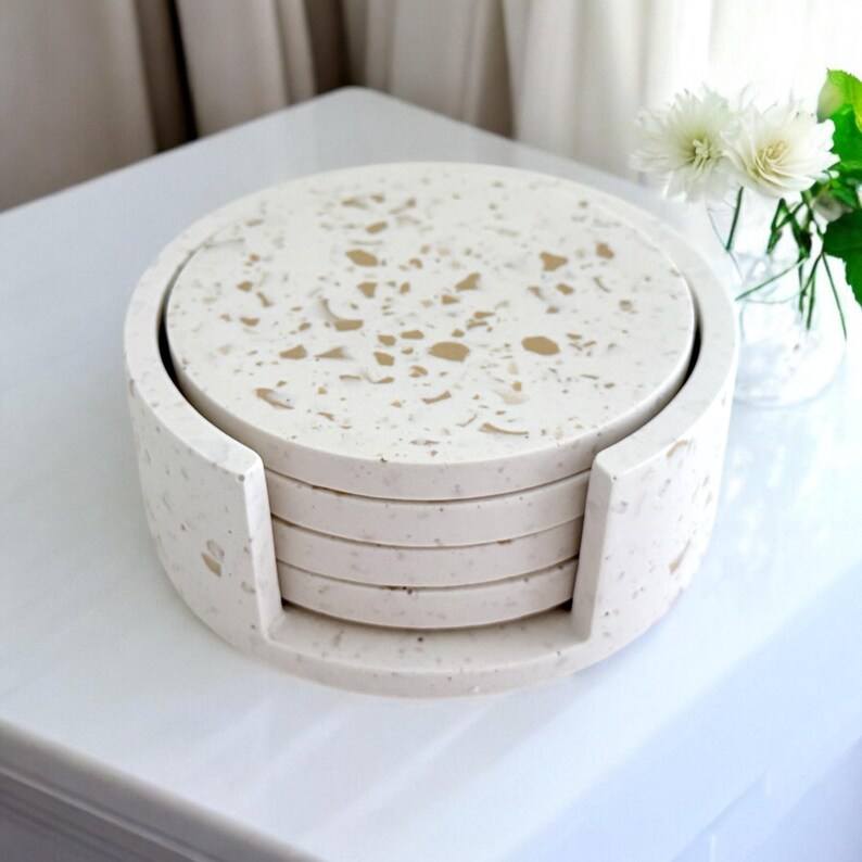 Holder And Coasters Set Of 4 Beige Speckle Effect Circle Stone Coaster Set Neutral Homeware Jesmonite Handmade Home Decor Gift