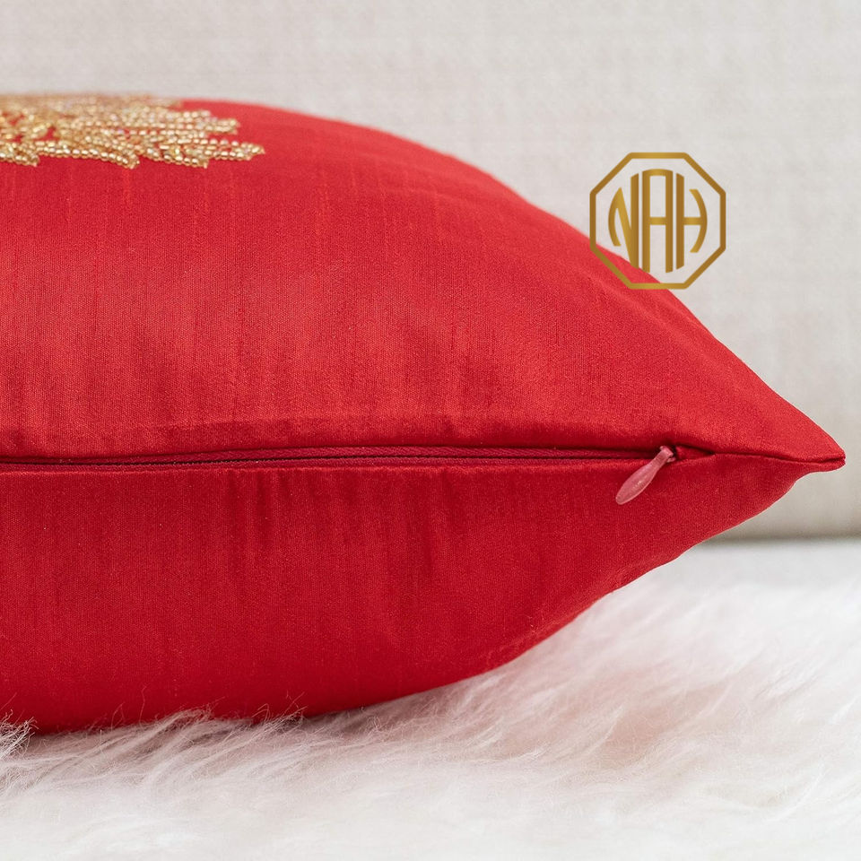 Holiday Silk Cushion Covers with Gold Christmas Tree Embroidery Red Green Beige Maroon Bulk Wholesale Exporter Factory Custom