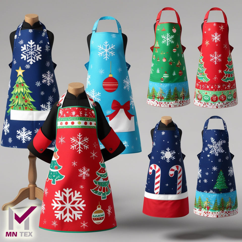 Holiday-themed Aprons with Vibrant Colors and Playful Prints, Making Every Christmas Meal Special.
