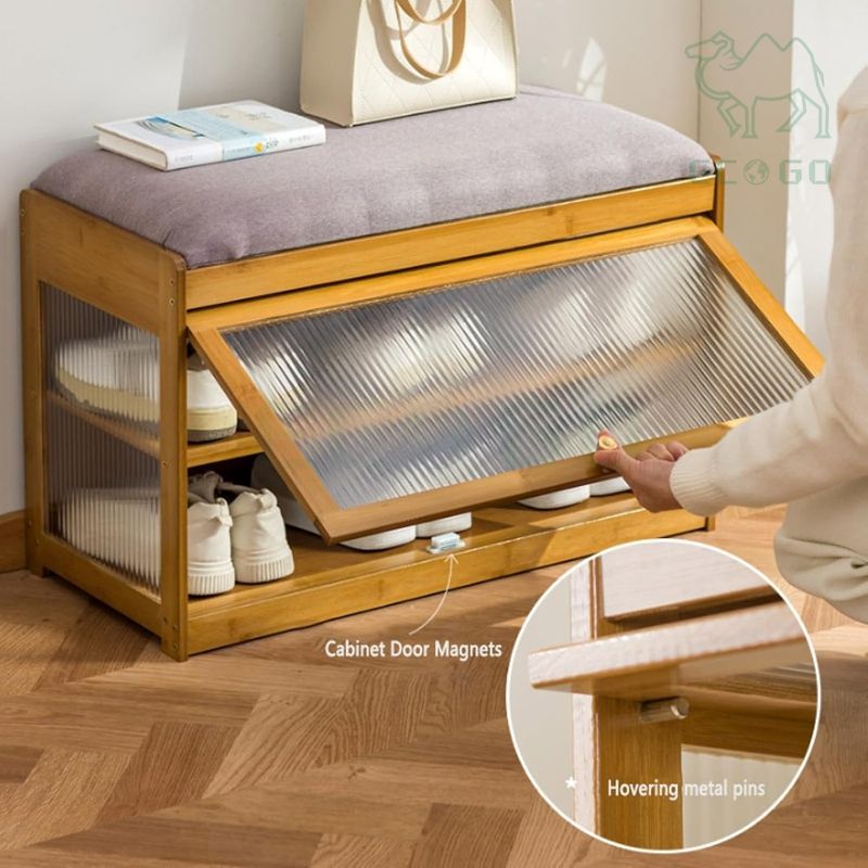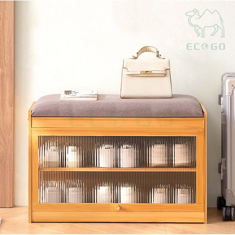 Home Furniture Display Rack Storage Cabinet Organizer Seat Cushion Double-Layer Bamboo Wood Shoe Rack with Windows