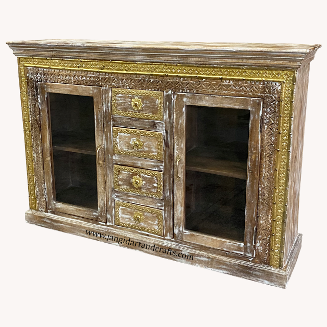 Home Furniture Rustic White Distress Drawer Chest Wood Cabinet Farmhouse Folk Style Carved Solid Wood Storage Glass Cabinet
