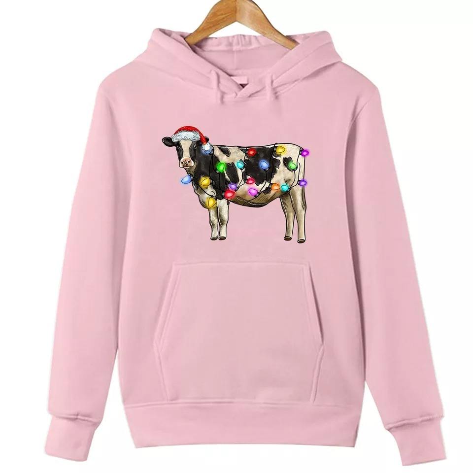 Hoodie Christmas Cow Heifer Santa Hat Light Decor Farm Farmer Gift Jumper Sweatshirts Pullover Hoodie for Men MS-HD-1110