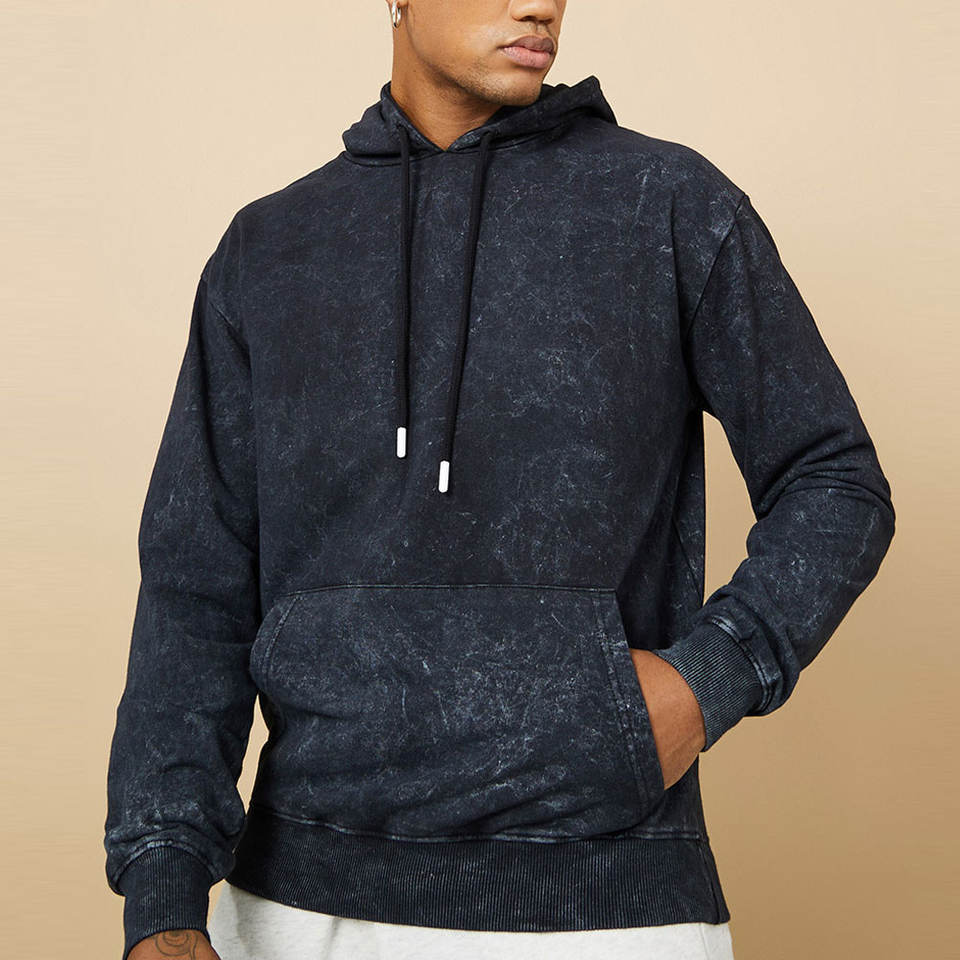 "Hoodies for Men Street Style Black Stone Wash Pullover with Front Pocket and Drawstring Hood"