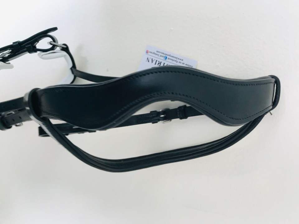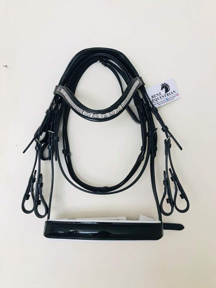Horse Double Bridle Anatomical Cut Back Headpiece Black Patent White Snaffle Dressage