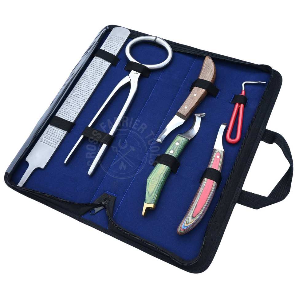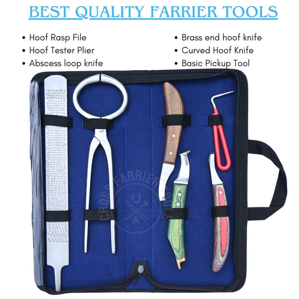 Horse Hoof Trimming Tool Kit with Hoof Pain Detector Inspection Abscess Cutting Loop Knife Rasp File Curved Sharpe Blade Pick