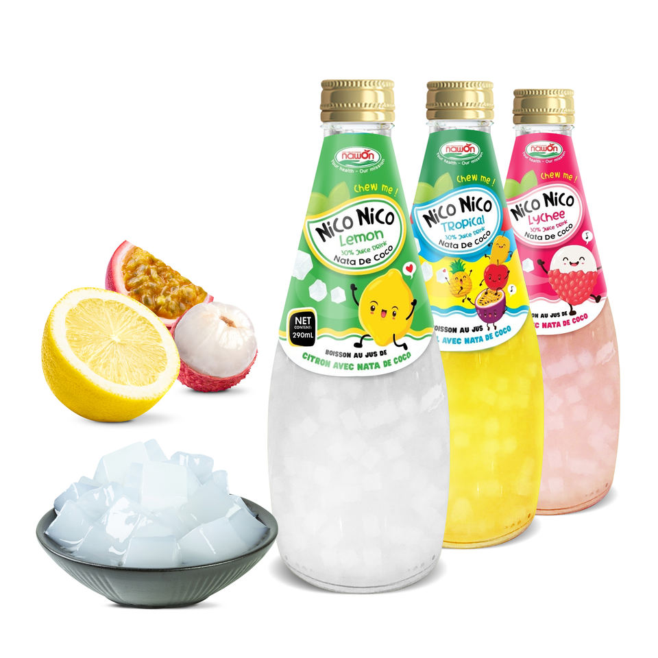 Mix Juice Drink with Nata De Coco Packed in Bottle 290ml Glass Bottle Eco Friendly Nico Nico Private Label Juice Manufacturer