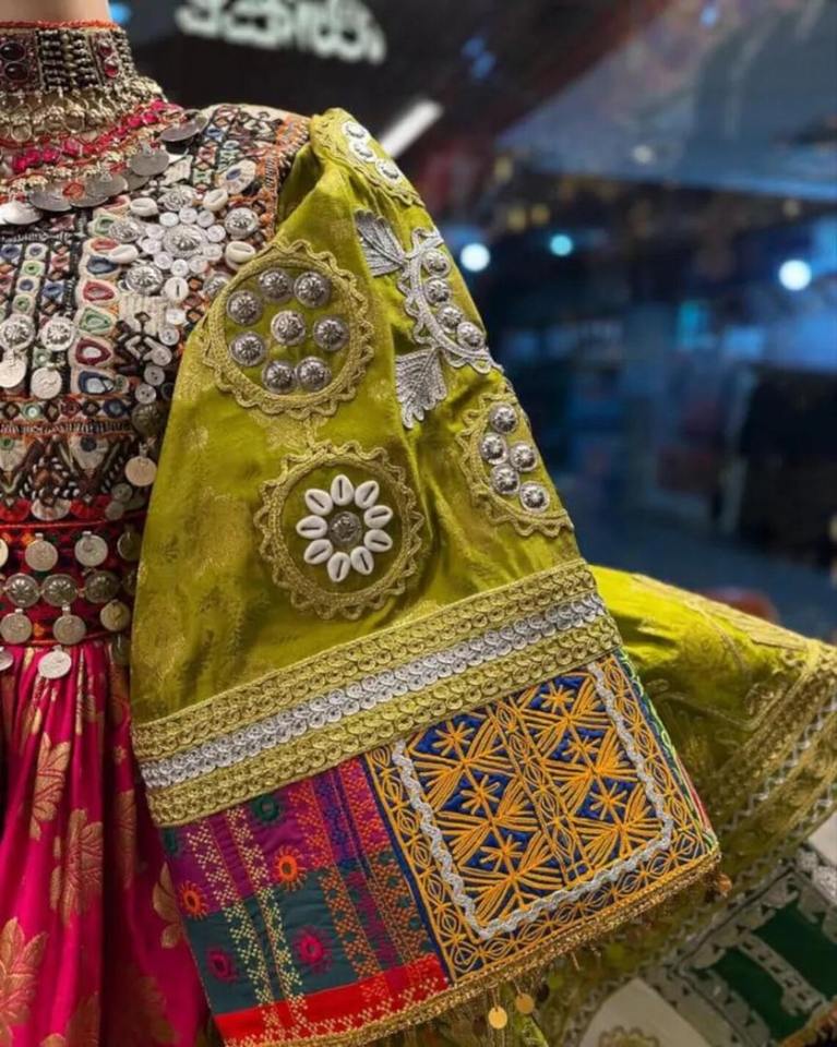 Hot Hand Embroidered Afghan Kuchi Dress With Yellow And Green Combination Featuring Colorful Dupatta With Intricate Embroidery