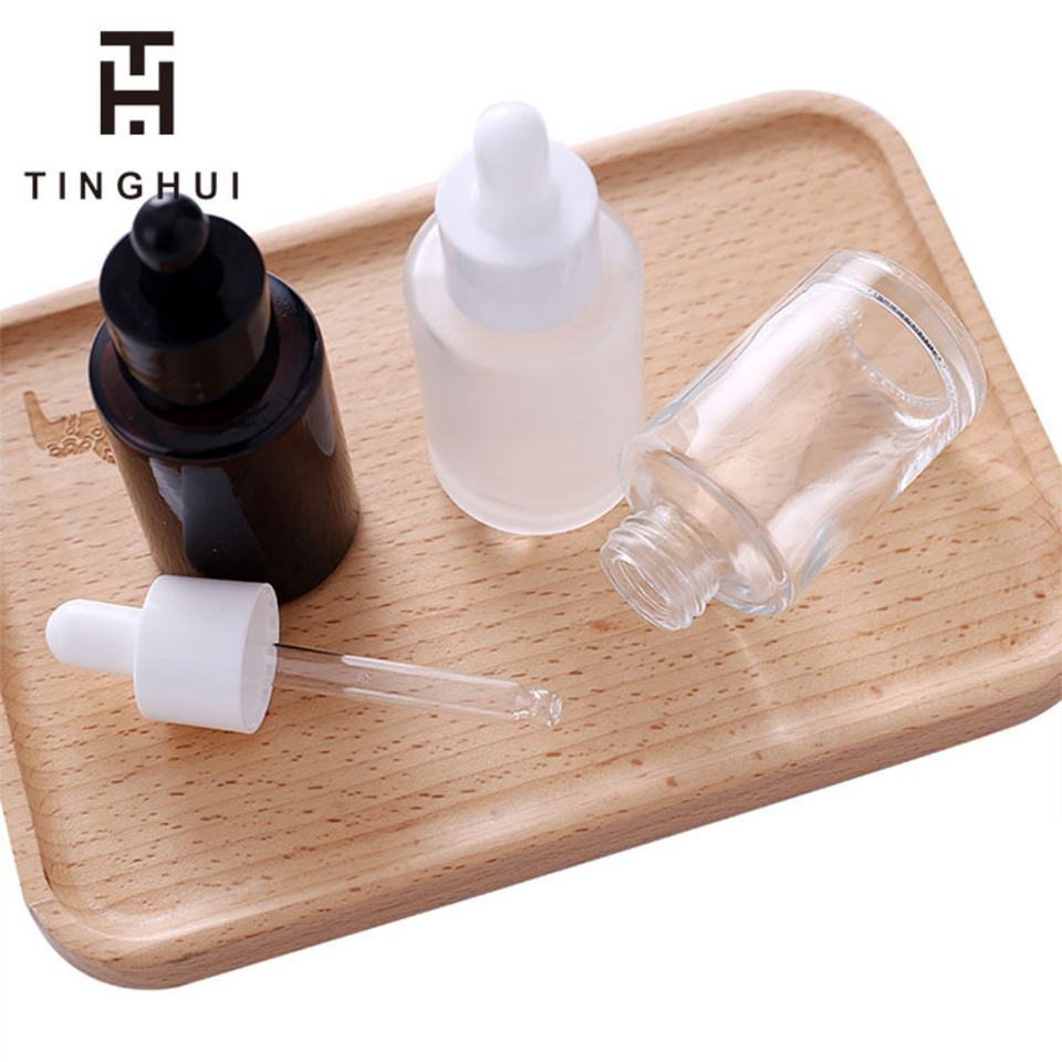 Hot Luxury 30ml 1oz Clear Amber Frost Flat Shoulder Round Shape Glass White Black Dropper Bottle