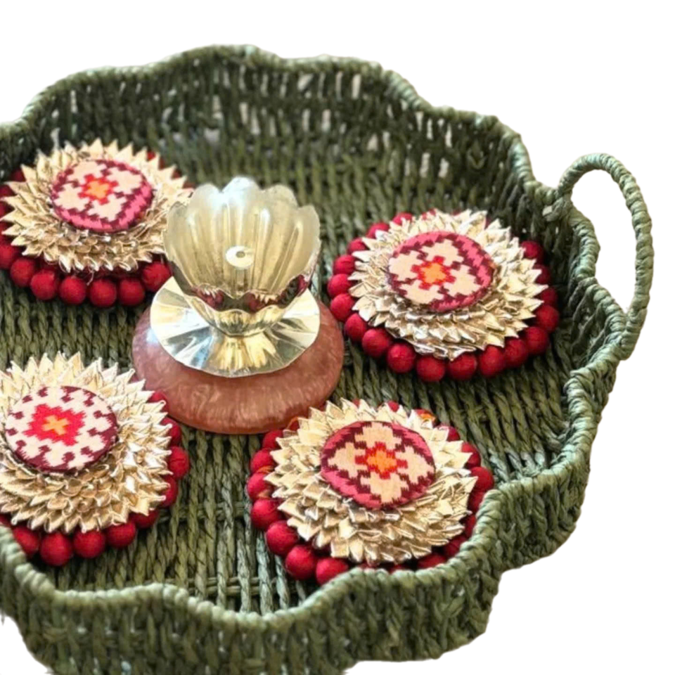 Hot New Trending Design Natural Floral Seagrass Woven Serving Tray for Display Drink Food Serving in Dinning Table Decor