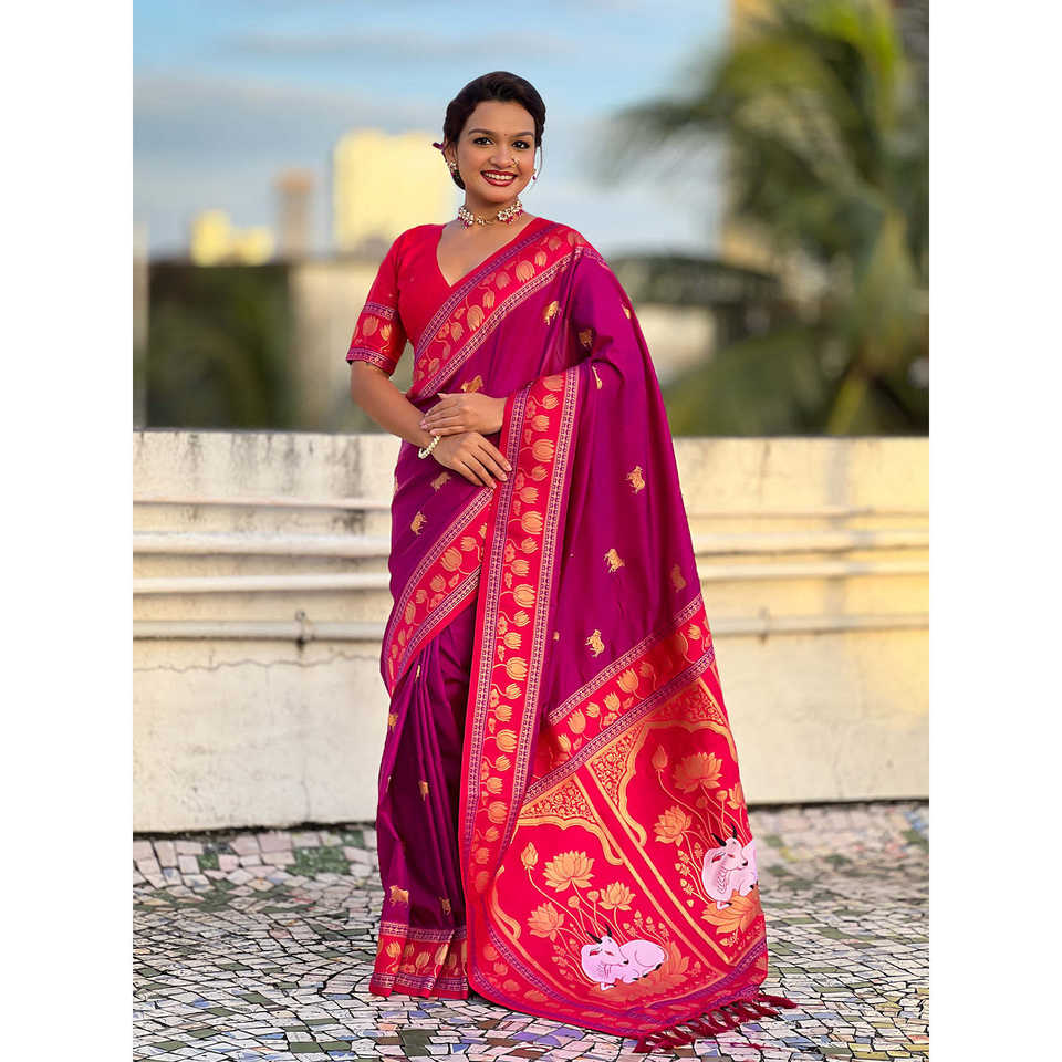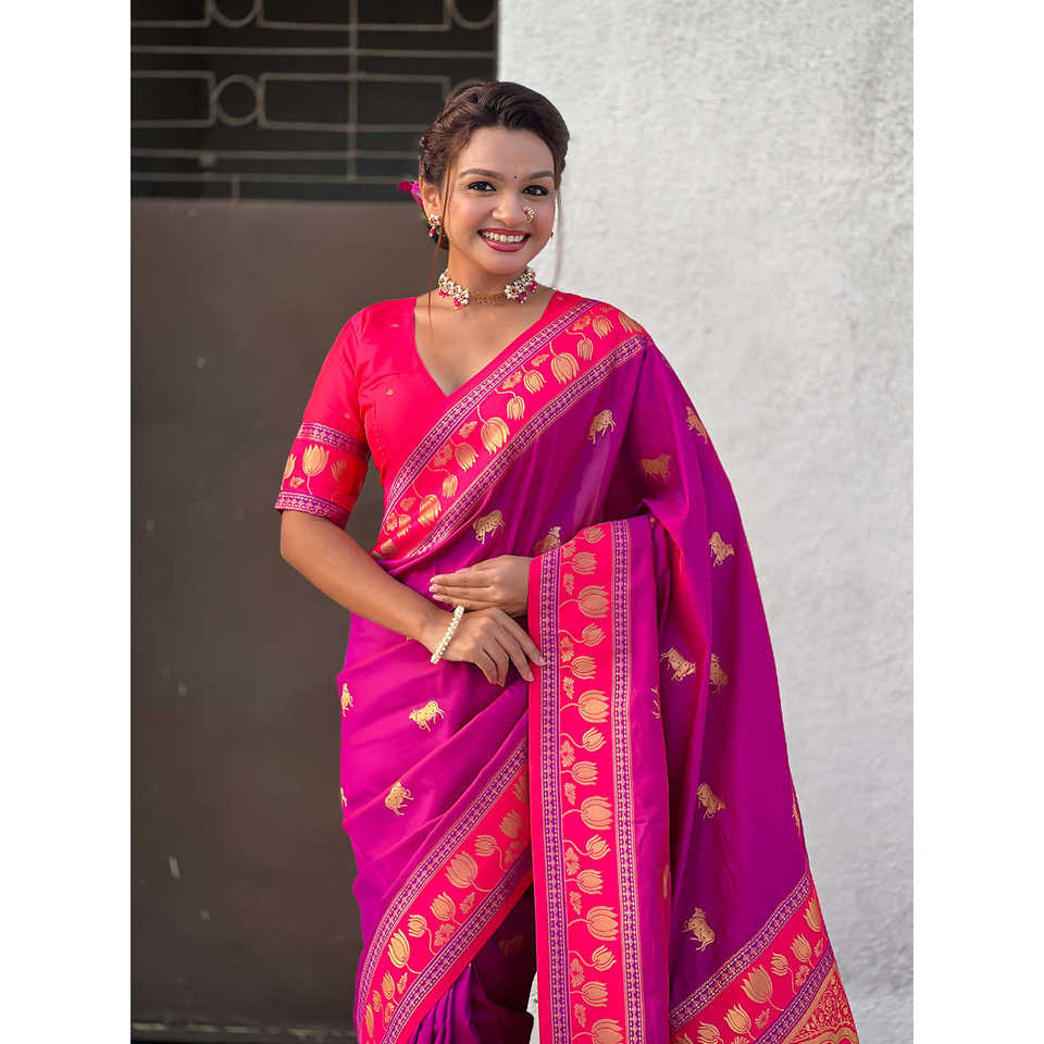 Hot Pink Soft Silk Pichwai Traditional Zari Woven Saree Elegant Evening Dresses