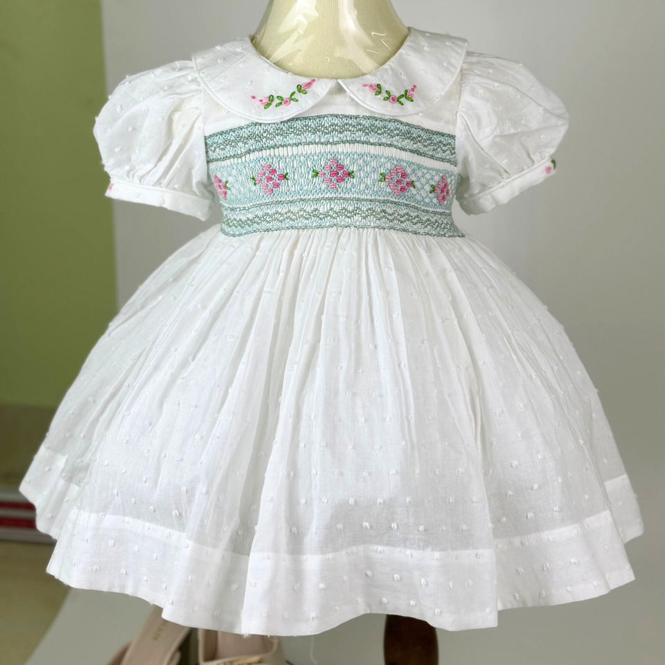 Hot Product Children's Clothing Smocked Dresses White Cotton Fabric with Florals for Baby Girls Princess Party Dresses OEM ODM