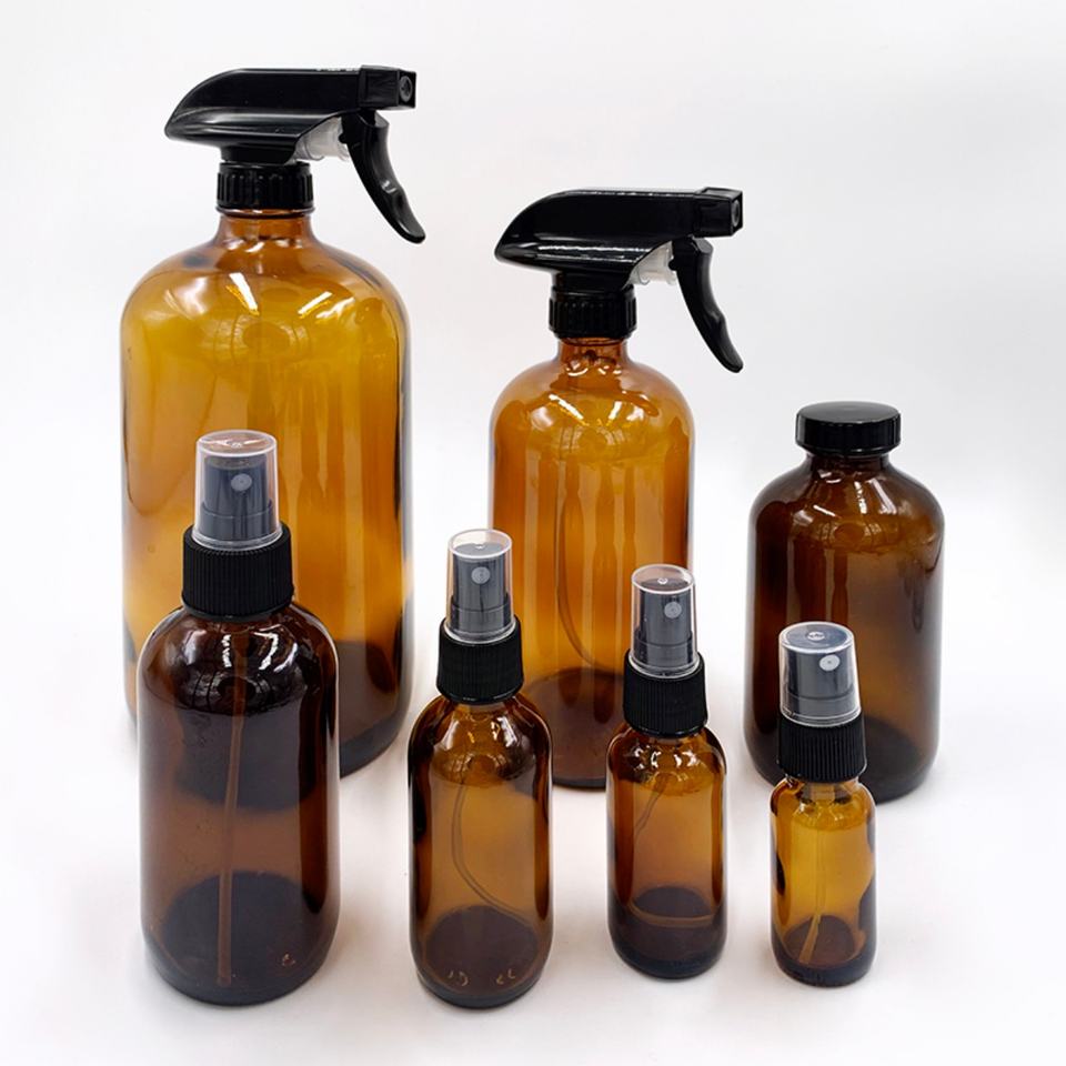 Hot Sale 15ml30ml120ml 150ml 200ml Essential Oil Amber Glass Boston Spray Bottle with Black Rat Head Half Hood Sprayer Packaging