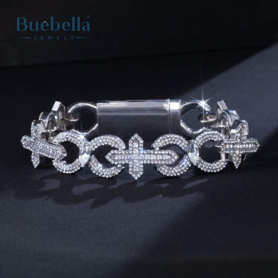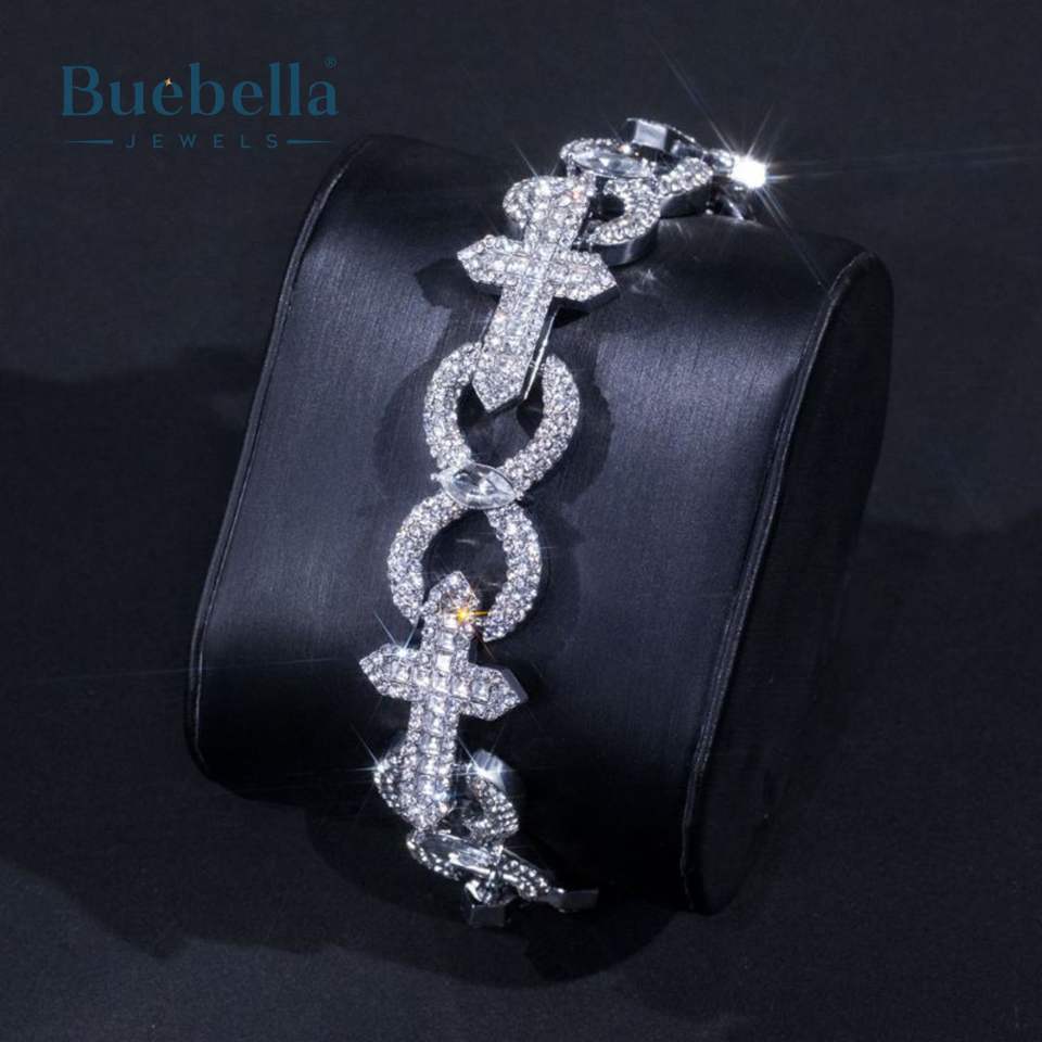 Hot Sale 15mm Baguette Cut Cross Infinity Link Bracelet for Men 14K White Gold 925 Silver for Parties and Gifts