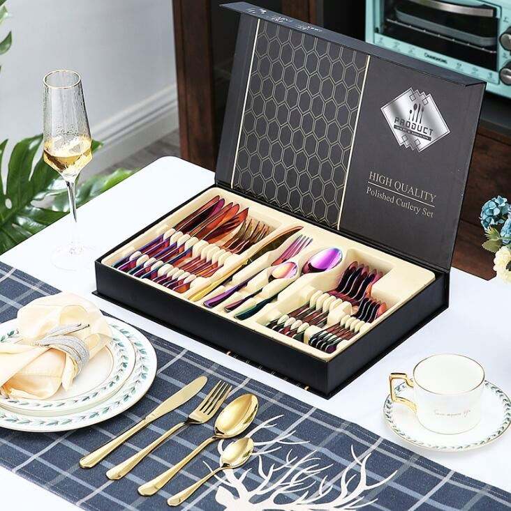 Hot Sale 24-Piece Reusable Eco-Friendly Gold Stainless Steel Cutlery Set Luxury Customizable Pattern Portable Weddings