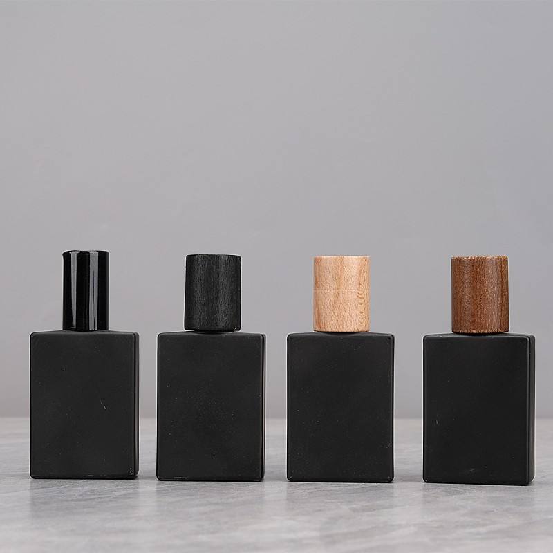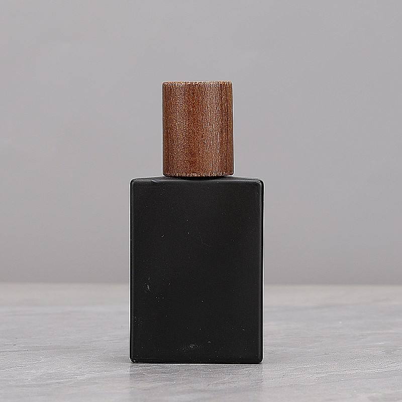 Hot Sale 30ml Frosted Black Square Pump Spray Perfume Glass Bottle for Perfume with Wooden Lid