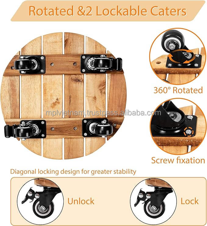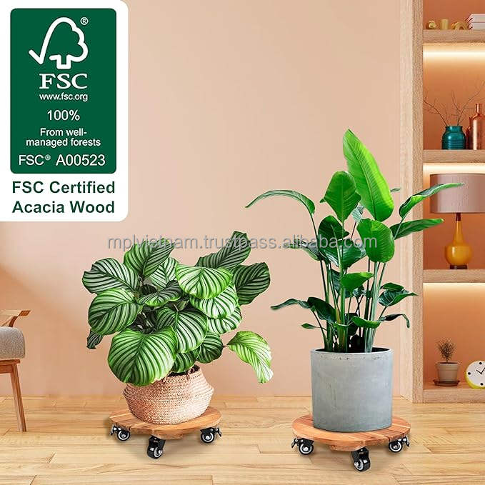 Hot Sale Acacia Wood Rolling Tray Plant Caddy Heavy Duty Round Planter Trolley with Lockable Casters for Home Use