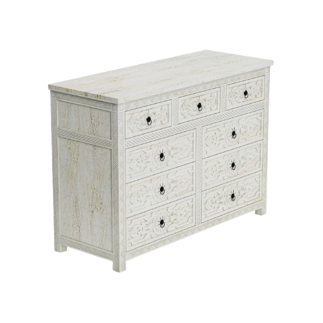 Hot Sale Best Quality Wooden Bedroom Furniture Burford Mahogany Wood 9 Drawer Distressed White Dresser Indonesia Manufactured