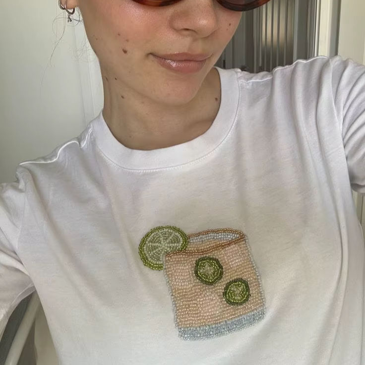 Hot Sale Cotton Long Sleeve T-Shirt Women Round Neck Beaded Cocktail Embroidery Casual Ladies Soft Jersey Drink Patch Tops Wear