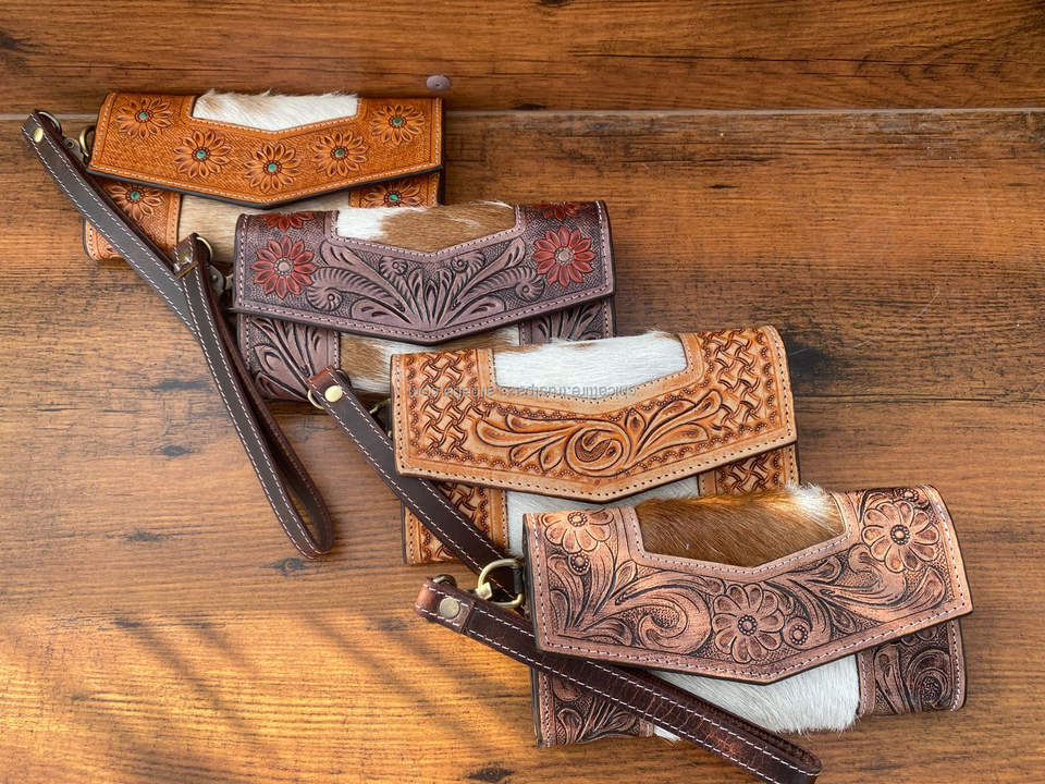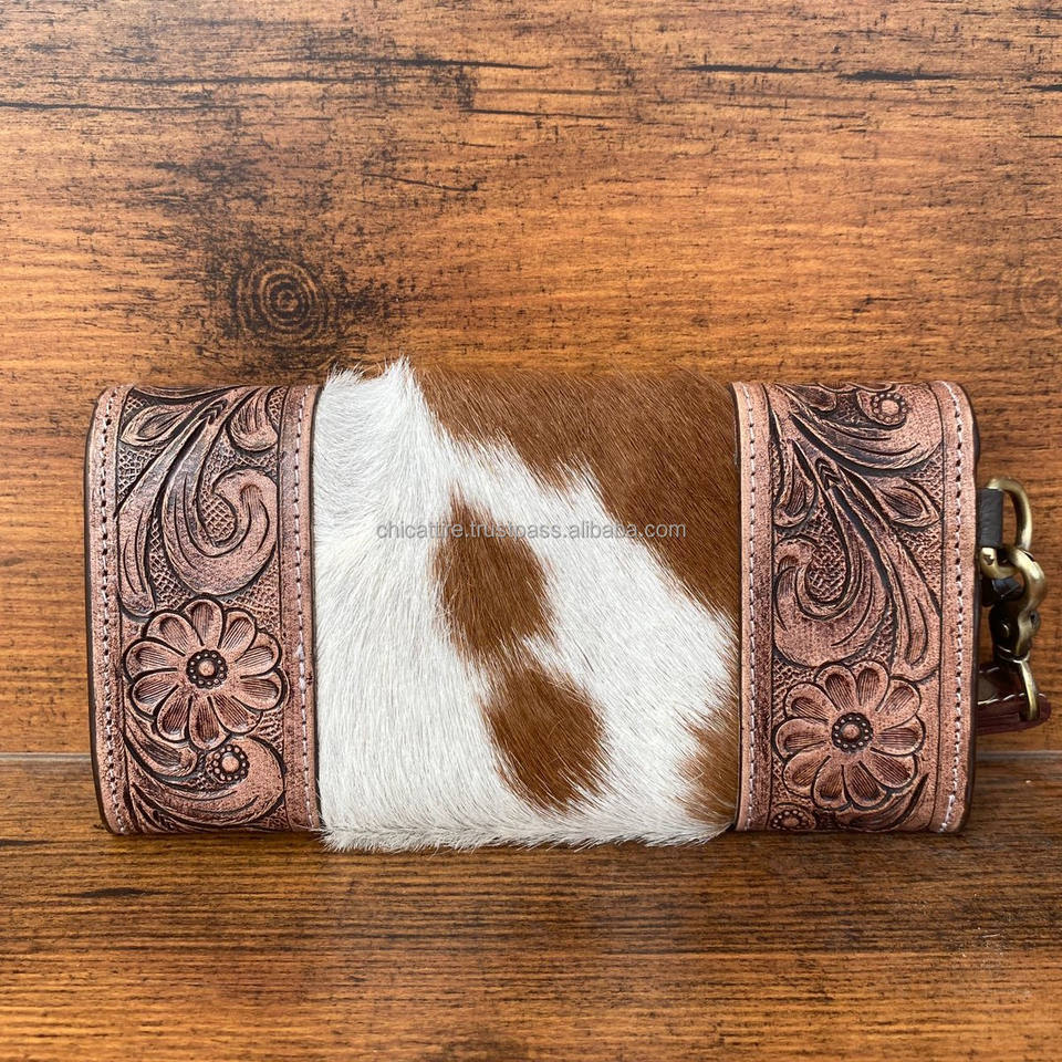 Hot Sale Cowhide Fur Clutch Stylish Hand Tooled Carving Leather Wallet Multi Uses Western Leather Stylish Wallets for Women's